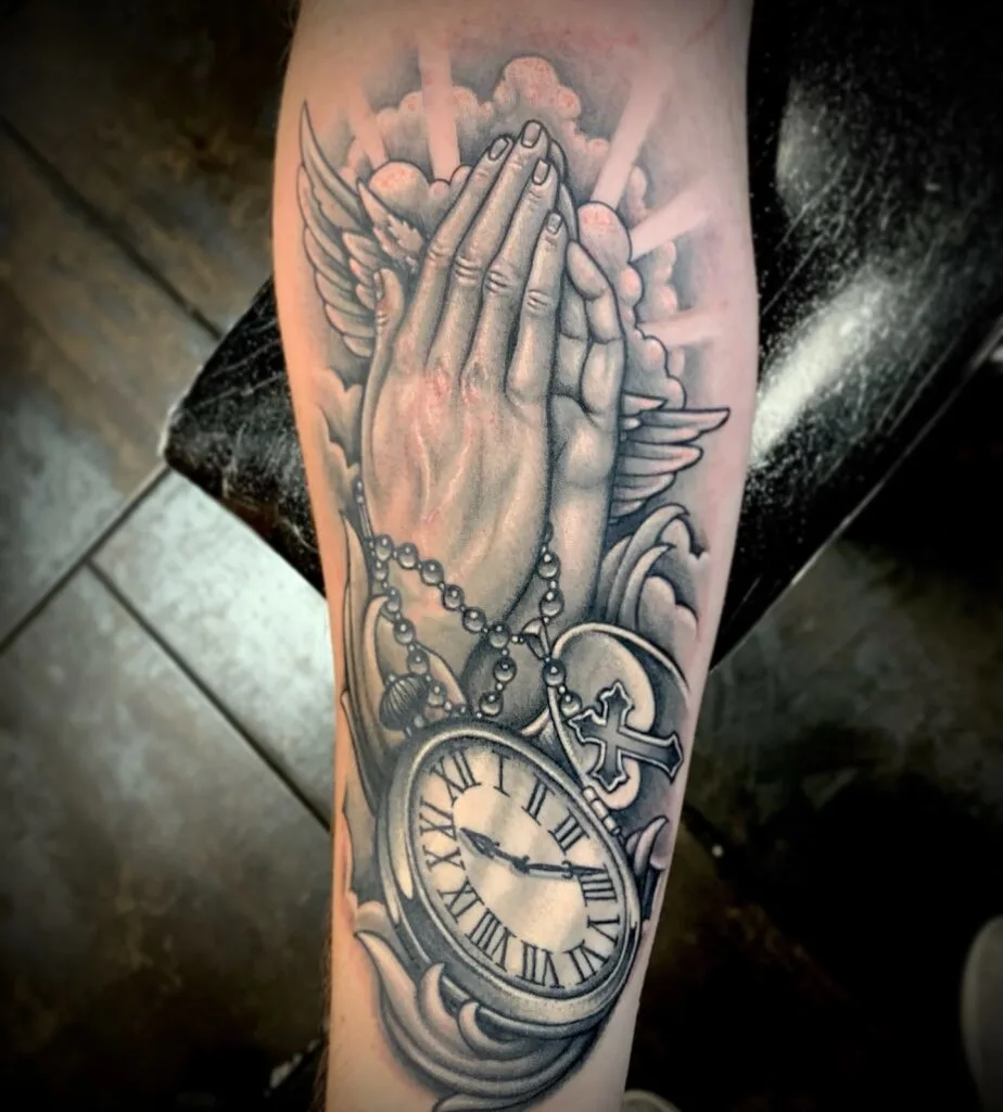 This detailed forearm tattoo blends timeless symbolism with spiritual meaning. At the center are realistic praying hands, surrounded by angel wings and radiant beams emerging from clouds above.