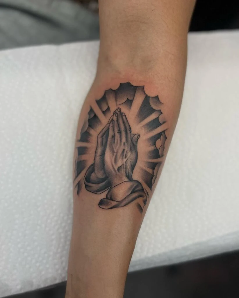 This black and grey upper arm tattoo features a pair of detailed praying hands surrounded by radiant beams and soft clouds. The shading highlights the hands’ anatomy, giving them a realistic and powerful look.