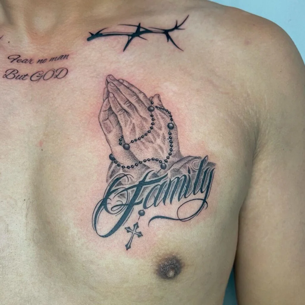 This meaningful chest tattoo features a pair of praying hands holding a rosary, with a flowing ribbon that reads “Familia.” The design highlights devotion and the importance of family, blending traditional religious symbolism with a personal touch.
