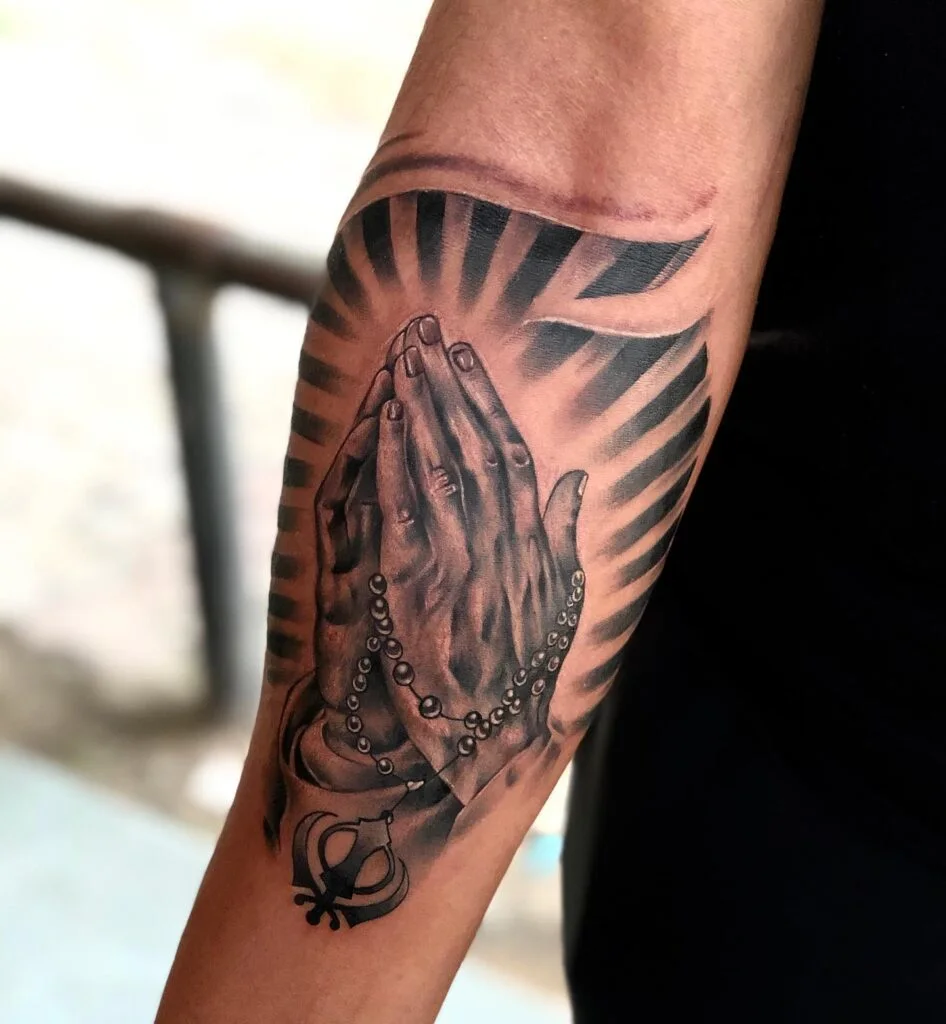 This forearm tattoo presents a powerful blend of faith and identity. At the center are detailed praying hands, wrapped in a rosary with realistic beadwork and shading. Radiant beams burst from behind the hands, creating a divine halo effect that draws focus upward.
