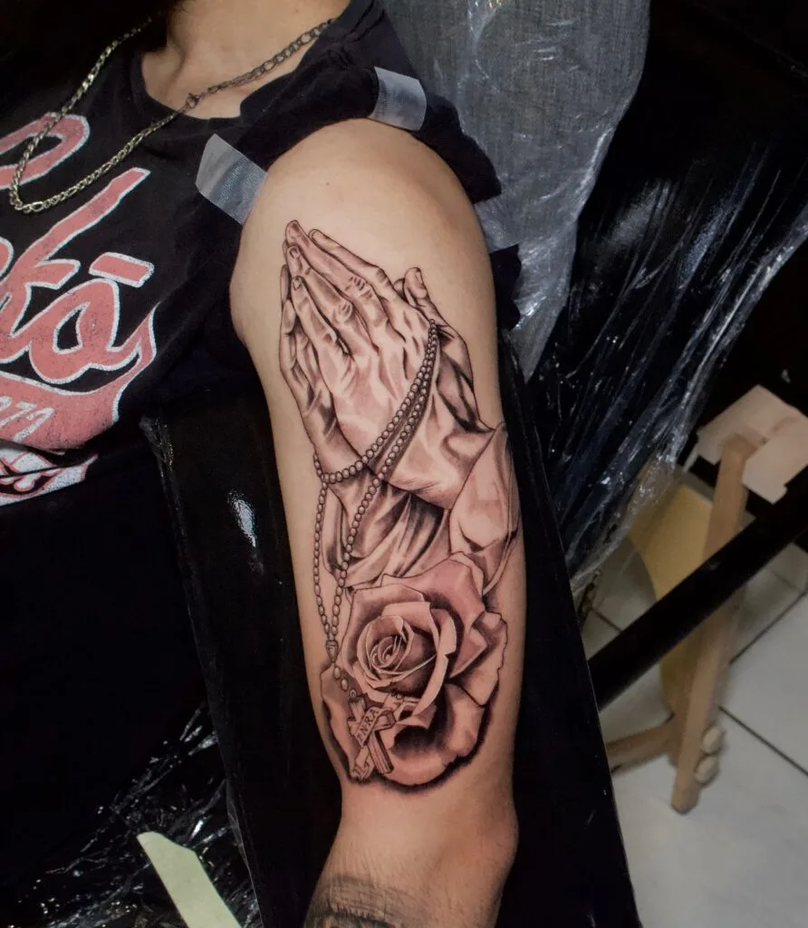 This upper arm tattoo features beautifully rendered praying hands with a detailed rosary draped across the fingers and flowing downward. At the base of the design rests a large, realistic rose, adding a strong emotional and visual anchor to the piece.
