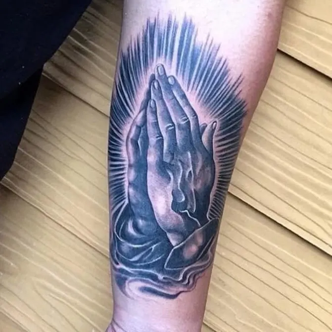 This striking forearm tattoo showcases a pair of praying hands radiating powerful energy, emphasized by bold beams of light extending outward.