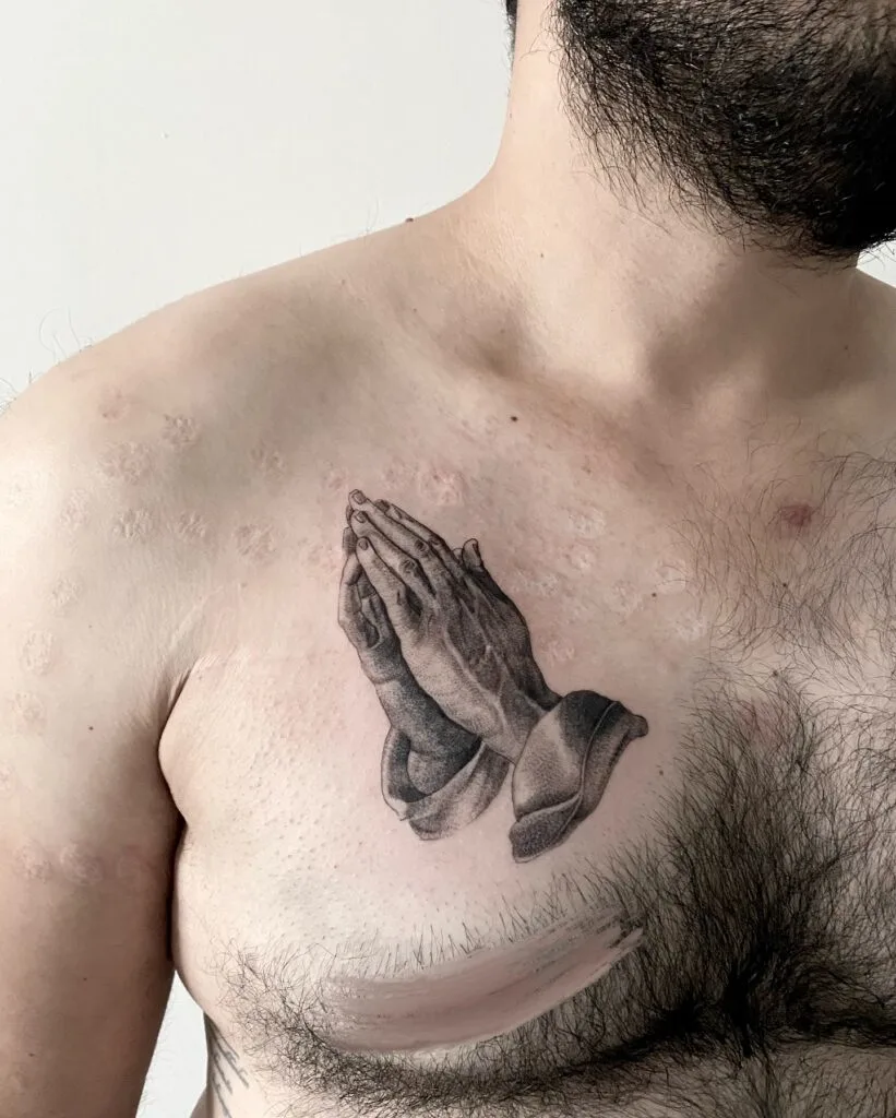 This chest tattoo presents a finely detailed pair of praying hands, executed with smooth black and grey shading for a lifelike effect. The subtle folds in the fabric and the anatomy of the hands show expert linework and realism.