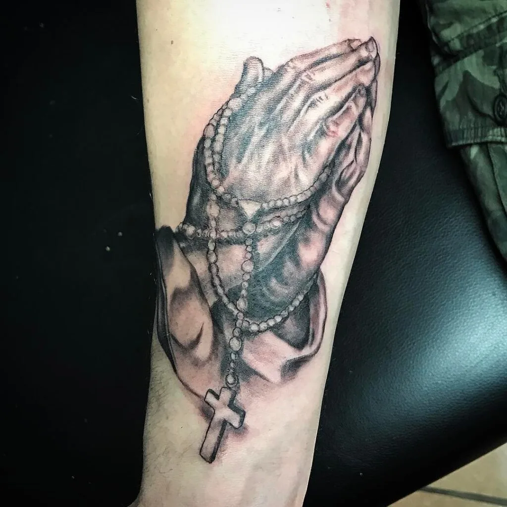 This detailed forearm tattoo shows a pair of praying hands wrapped in a rosary, with a cross pendant prominently displayed. The black and gray shading enhances the realistic texture of the hands and the beads, creating depth and emotion.