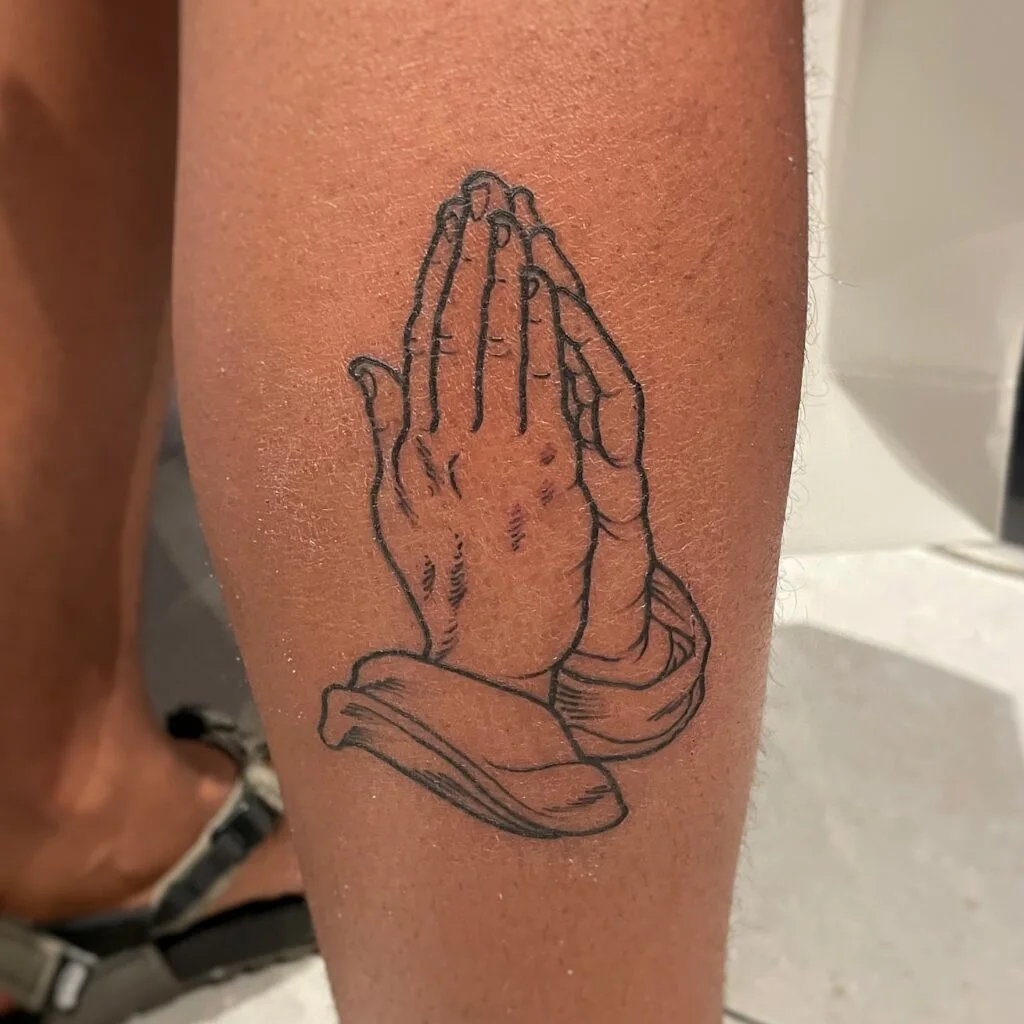 This clean and minimal tattoo features the classic image of praying hands drawn with bold, fine black outlines. The design is placed on the calf and avoids shading, giving it a light, hand-sketched look that feels intentional and timeless.