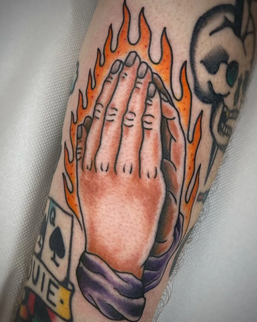 This bold tattoo features classic praying hands wrapped in a purple cloth, surrounded by vivid orange flames. Executed in an American traditional style, it uses heavy outlines, saturated color, and simplified forms for maximum visual impact.