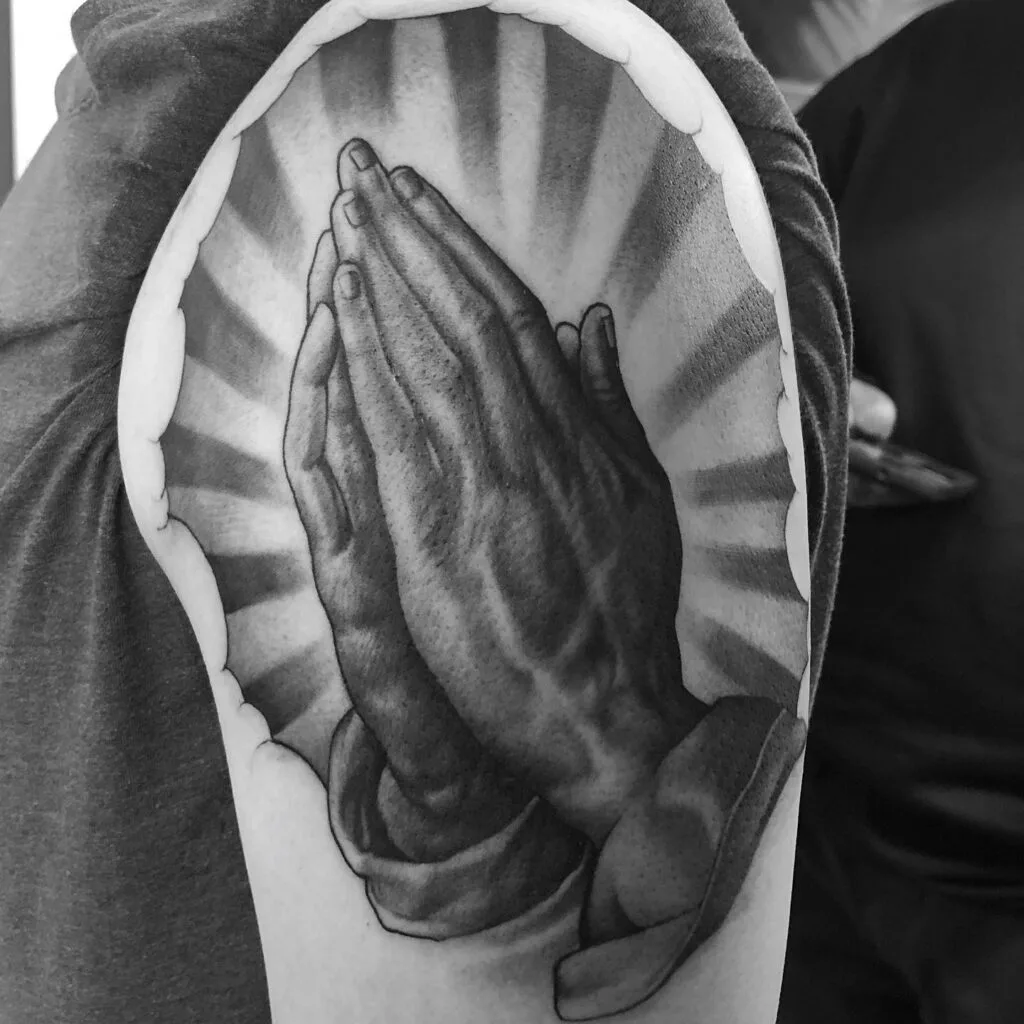This black and grey upper arm tattoo features a pair of detailed praying hands surrounded by radiant beams and soft clouds. The shading highlights the hands’ anatomy, giving them a realistic and powerful look.