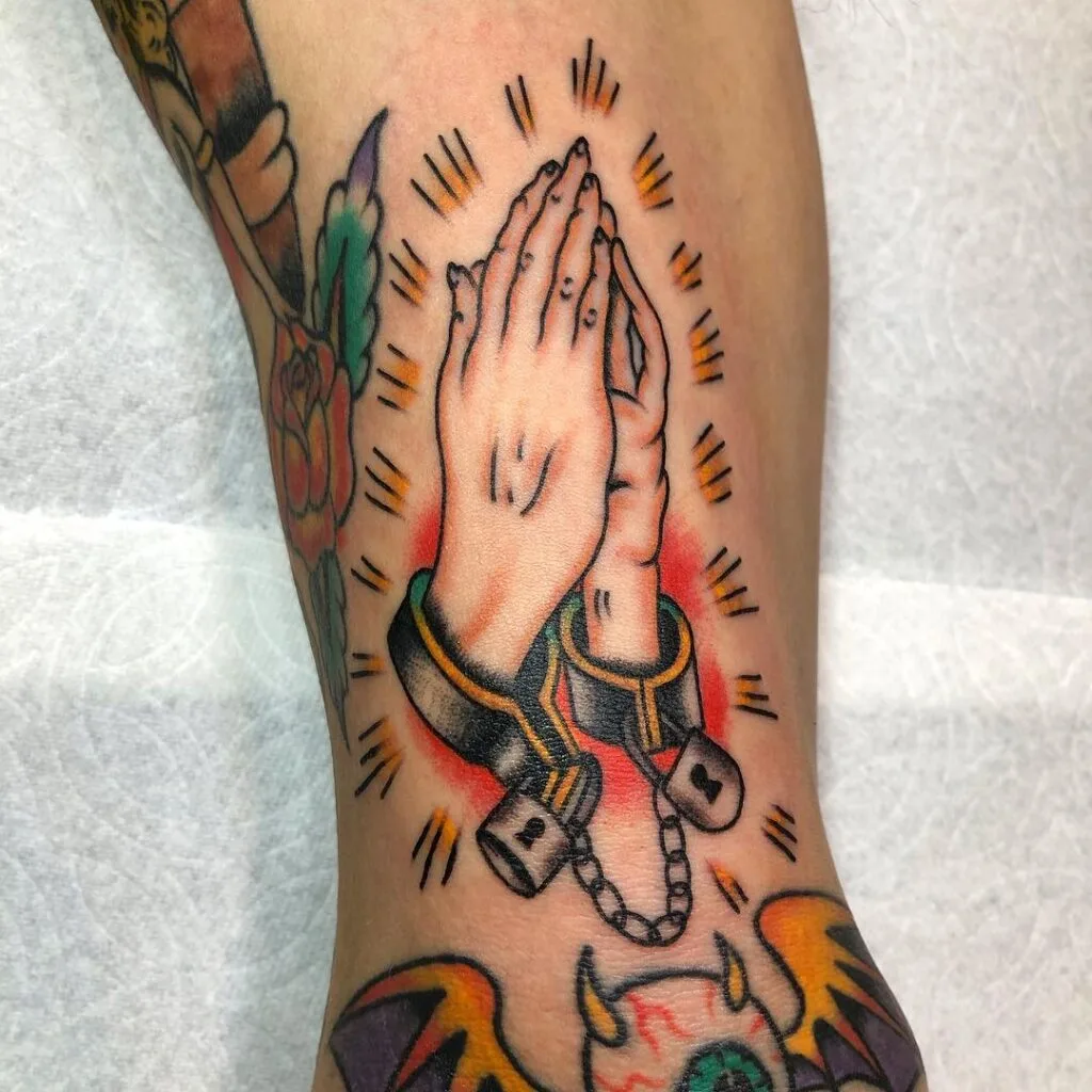 This bold traditional-style tattoo features a pair of praying hands restrained by handcuffs, surrounded by radiant black and orange lines.
