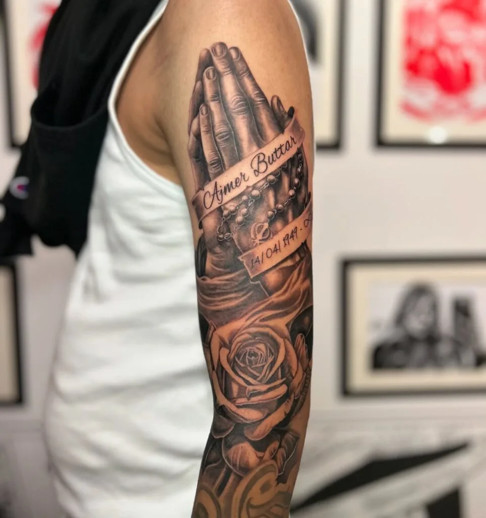 The shading throughout the tattoo enhances depth and realism, especially in the folds of the fabric and petals of the rose. The cross hanging from the rosary completes the composition with a sacred symbol. This piece combines devotion and remembrance in a powerful full-arm tribute.