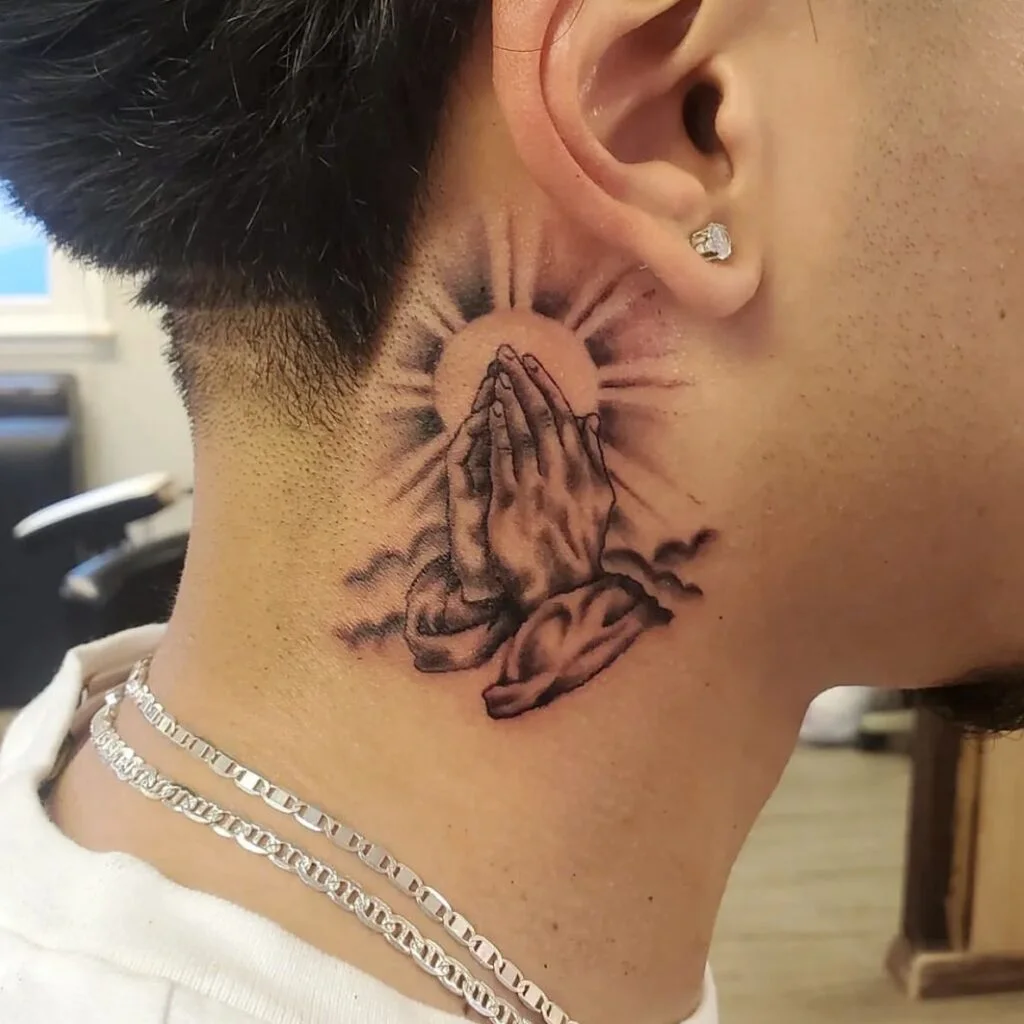 The design uses smooth shading to give depth and contrast, making the hands appear raised against the glowing backdrop. Positioned just below the ear, it’s a high-visibility piece that carries strong spiritual energy. This tattoo is a striking expression of unwavering faith, designed to be seen and felt every day.