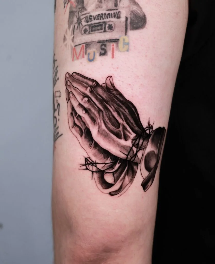 The hands are inked with pronounced lines and textured shading, giving them a rugged, traditional feel. The flowing cuffs enhance the classic aesthetic. Positioned among other tattoos, this piece still stands out as a symbolic and visually striking tribute to prayer, strength, and spiritual focus.