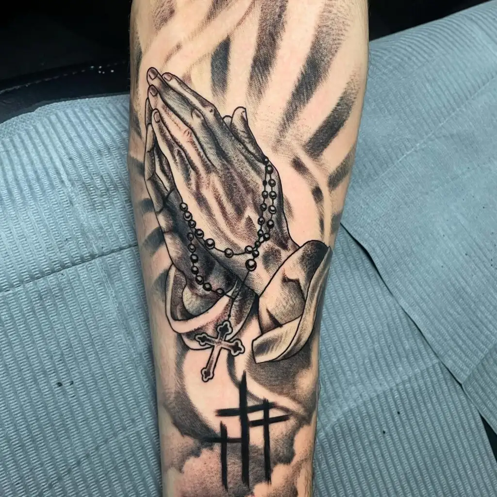 This detailed forearm tattoo shows a pair of praying hands wrapped in a rosary, with a cross pendant prominently displayed. The black and gray shading enhances the realistic texture of the hands and the beads, creating depth and emotion.