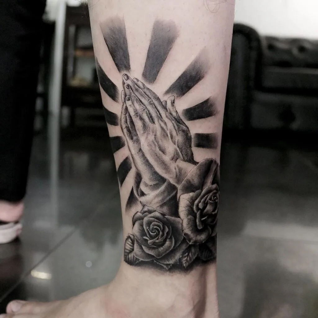 Placed on the lower leg, this tattoo features detailed praying hands emerging from two finely shaded roses. Behind the hands, dramatic black beams radiate outward in a fan-like pattern, creating a powerful halo effect that draws attention to the spiritual centerpiece.