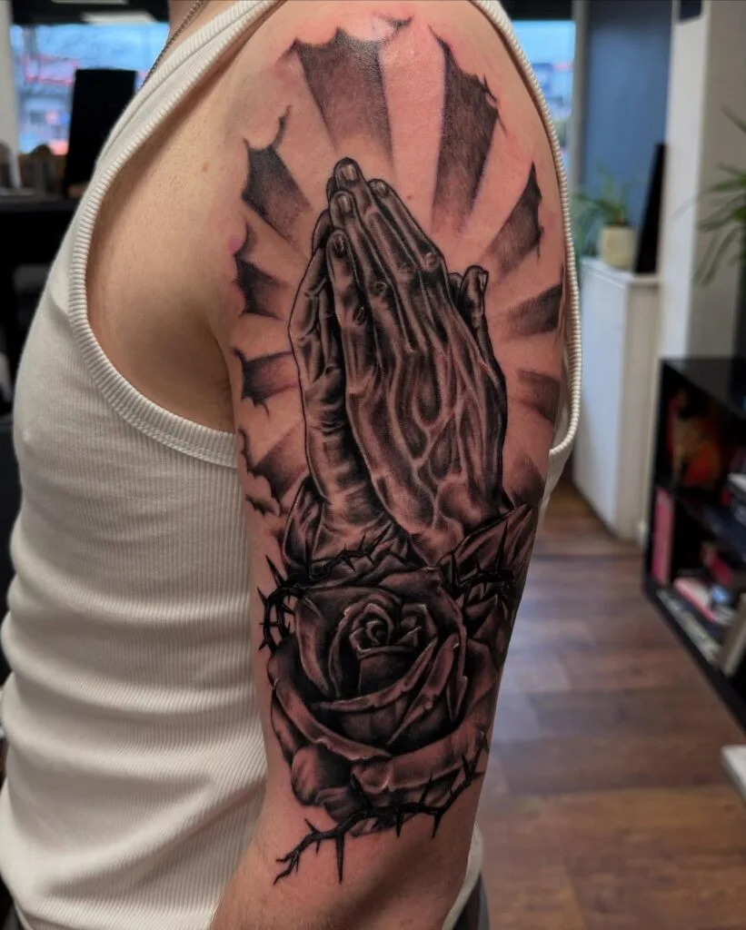 This upper arm tattoo powerfully blends faith and sacrifice. It features detailed praying hands with veins clearly defined, placed against a backdrop of bold, radiant beams. Below the hands sits a deeply shaded rose wrapped in a crown of thorns—symbolizing both beauty and suffering.