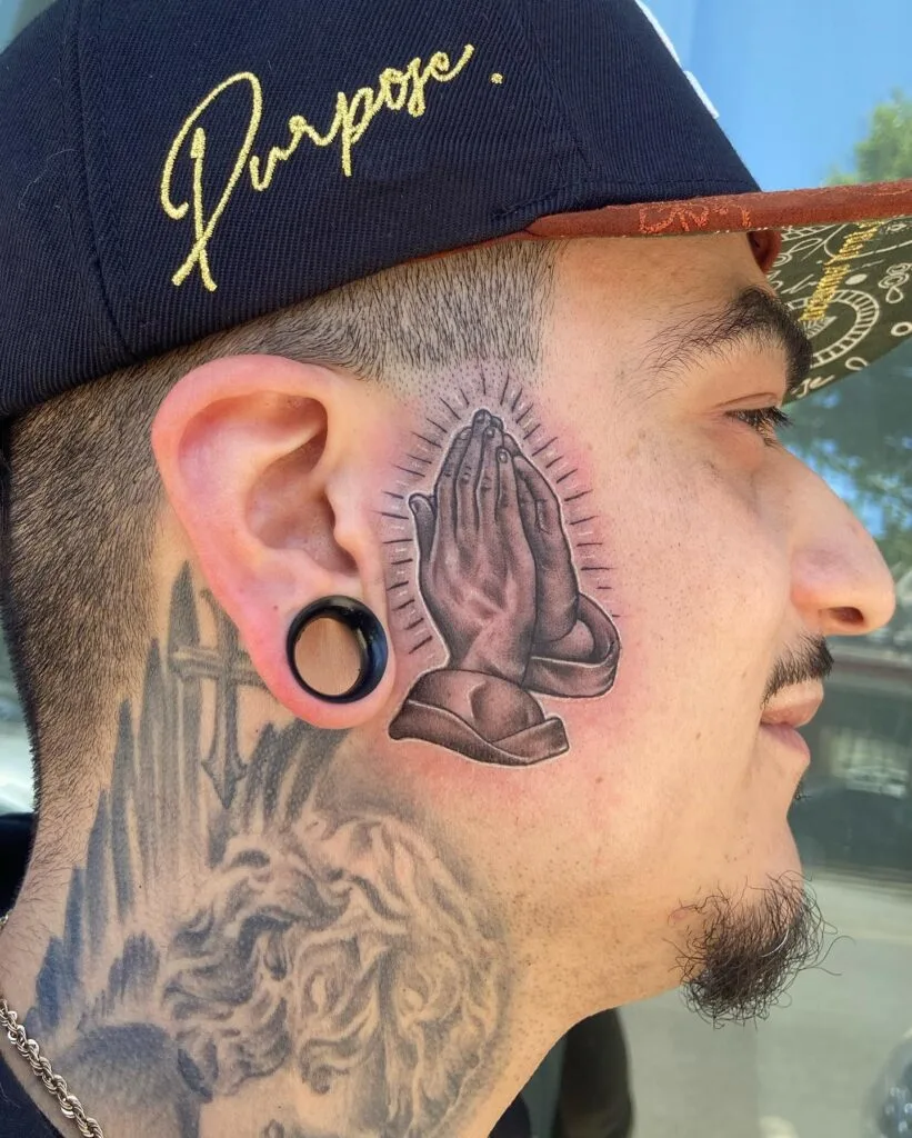 Radiating lines surround the hands like a halo, emphasizing reverence and divine focus. The placement makes a strong personal statement, blending bold commitment with spiritual devotion. It’s a daring yet meaningful design that turns a traditional symbol into a standout facial piece.
