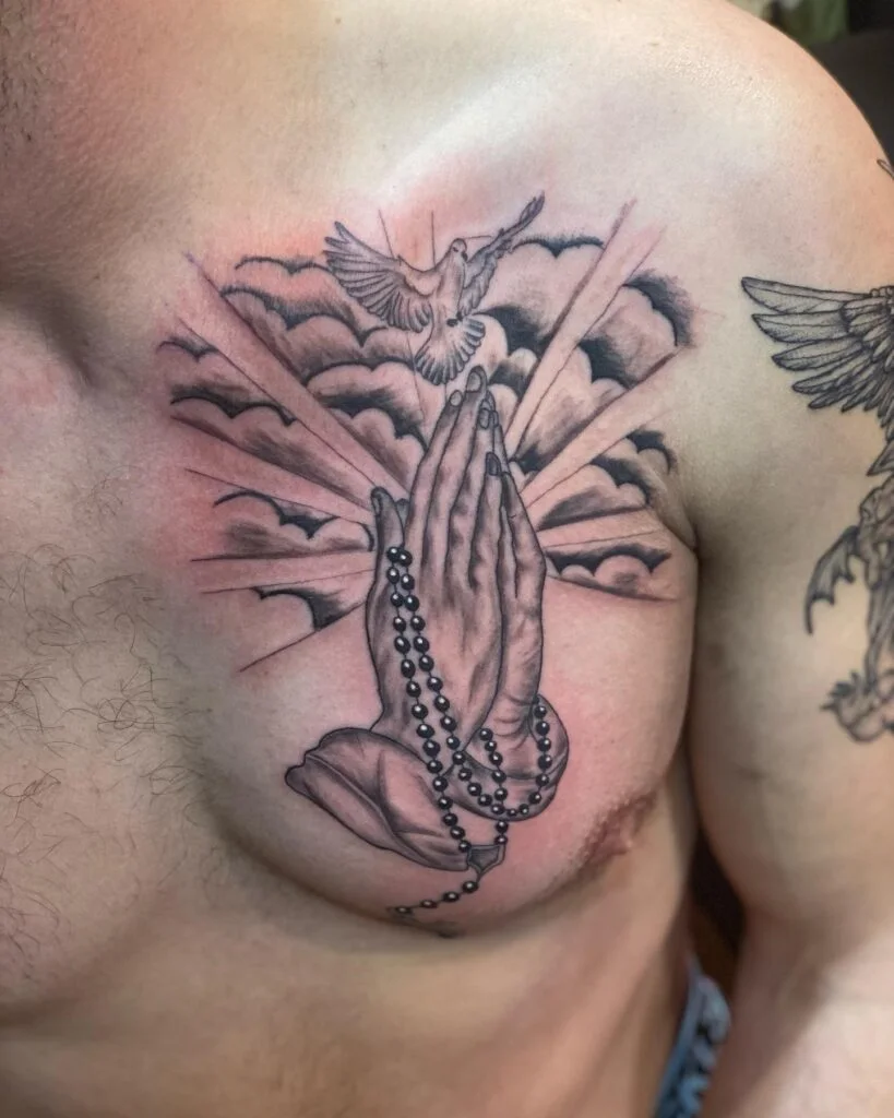 This beautifully placed chest tattoo features praying hands holding a rosary, set against a backdrop of radiant beams and stylized clouds. Rising above the hands is a gracefully detailed dove in flight, symbolizing peace and spiritual freedom.