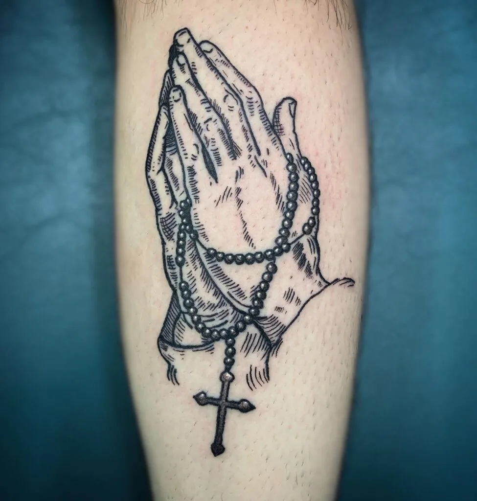 This calf tattoo combines traditional religious symbols into a powerful composition. It features praying hands holding a detailed rosary that drapes downward into a bold cross. Beneath the hands, a pair of angel wings spread outward, adding a sense of divine protection and grace.