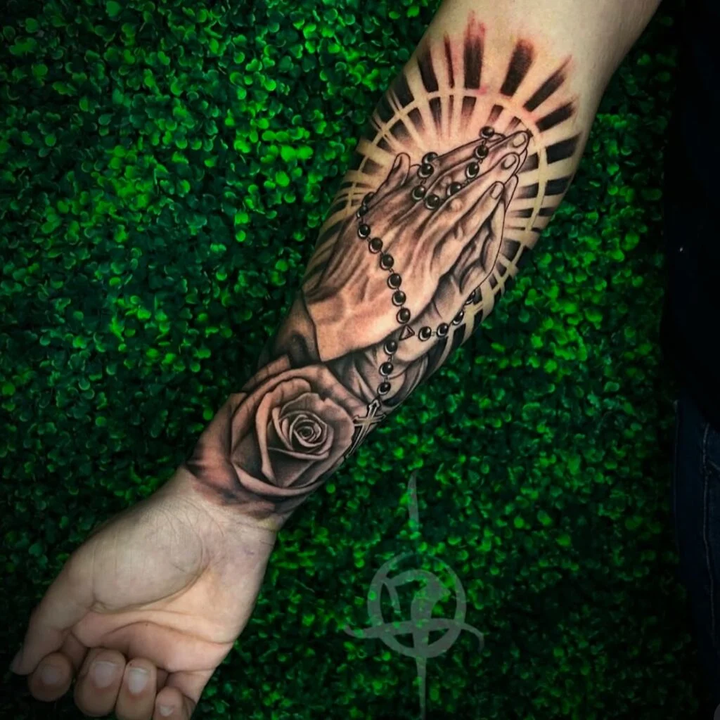 Praying Hands with Rosary, Rose, and Radiant Halo Tattoo