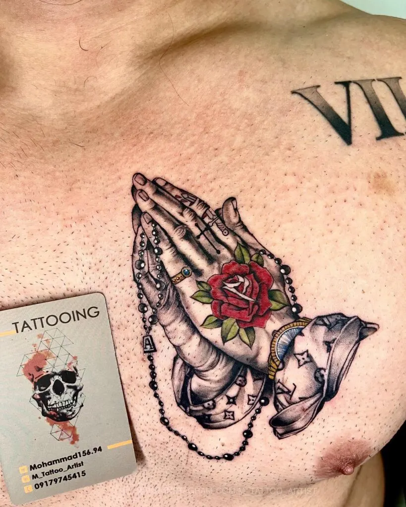 This vibrant chest tattoo reimagines the classic praying hands with bold personalization. The hands are adorned with a detailed rosary, rings, and tattoos, including a striking red rose and a visible cross. The cuffs feature a patterned design resembling luxury branding, blending faith with fashion.