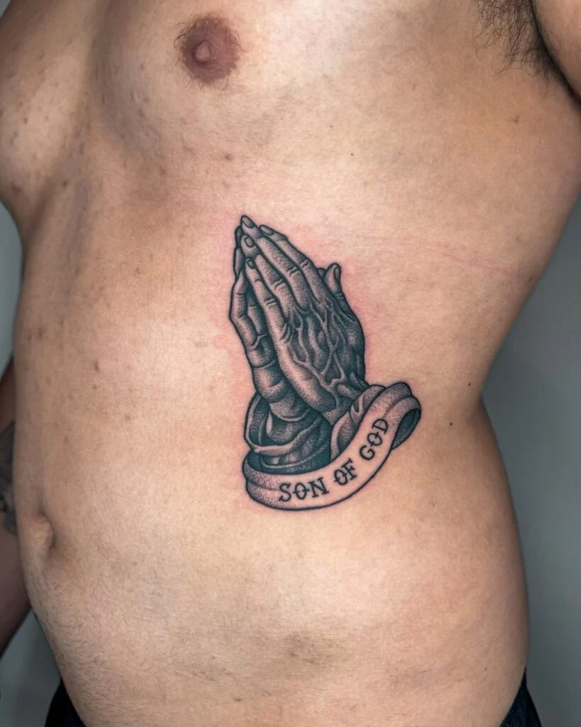 Located on the side of the torso, this tattoo features a traditional pair of praying hands wrapped with a flowing banner that reads “SON OF GOD.”