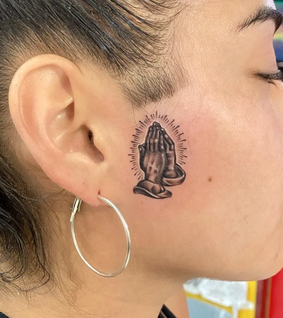 This striking tattoo features a classic pair of praying hands placed boldly on the side of the face, just in front of the ear. The hands are detailed with dark shading and wear draped sleeves, adding a sense of depth and realism.