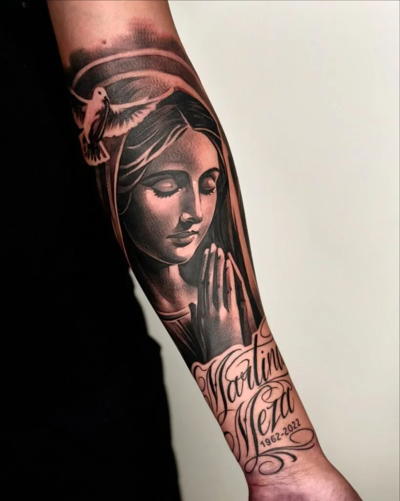 This forearm tattoo beautifully portrays the Virgin Mary with closed eyes and hands in prayer, radiating serenity and spiritual grace. Above her, a dove in flight symbolizes peace and divine presence.