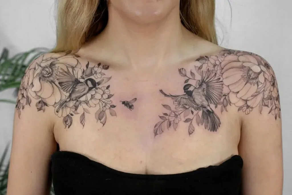 This tattoo beautifully spans across the chest and shoulders, featuring two detailed birds surrounded by large blossoms and leaves.