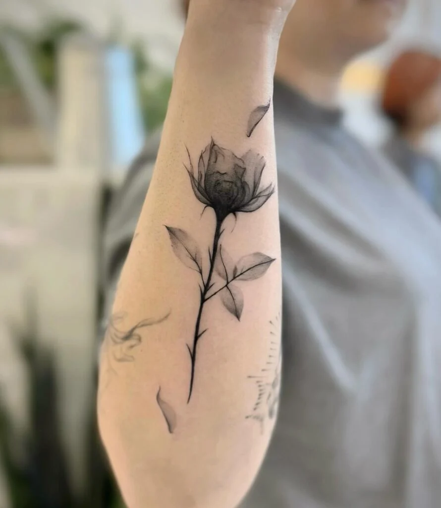 This tattoo showcases a beautifully shaded rose inked in black and grey on the forearm. The petals are softly blended, giving the flower a delicate, almost ethereal look, while the stem and leaves add balance to the design.