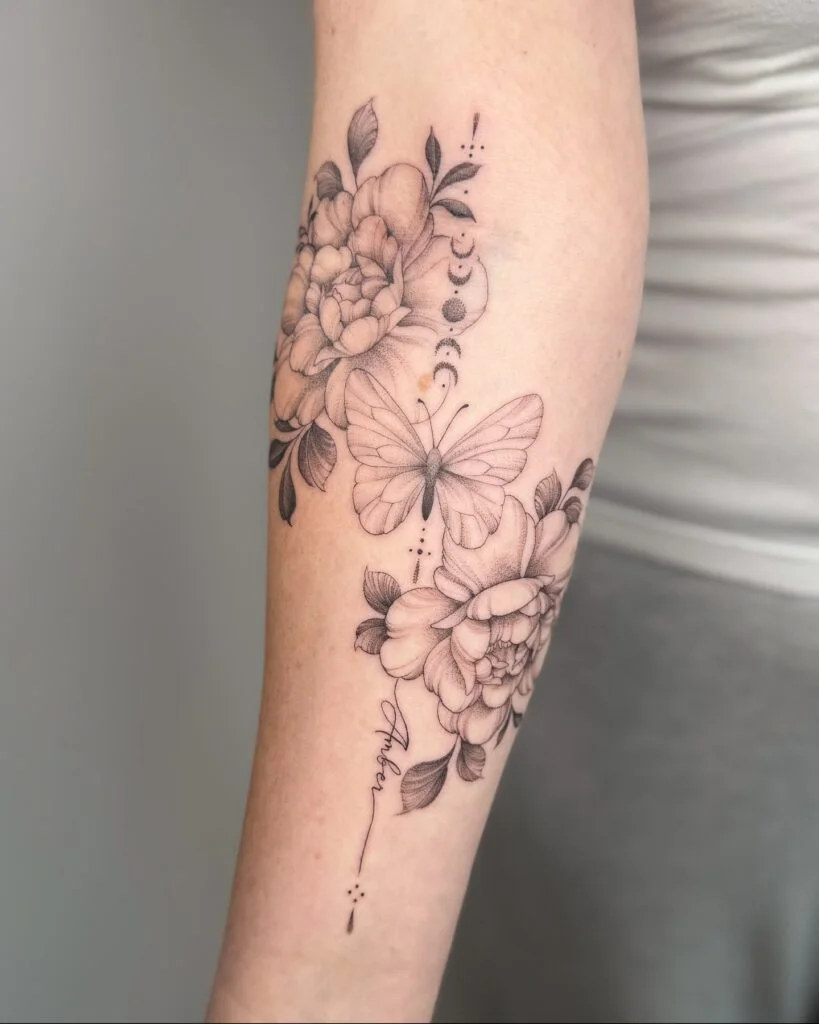 This tattoo beautifully combines two blooming flowers, a butterfly, and delicate ornamental accents along the forearm.