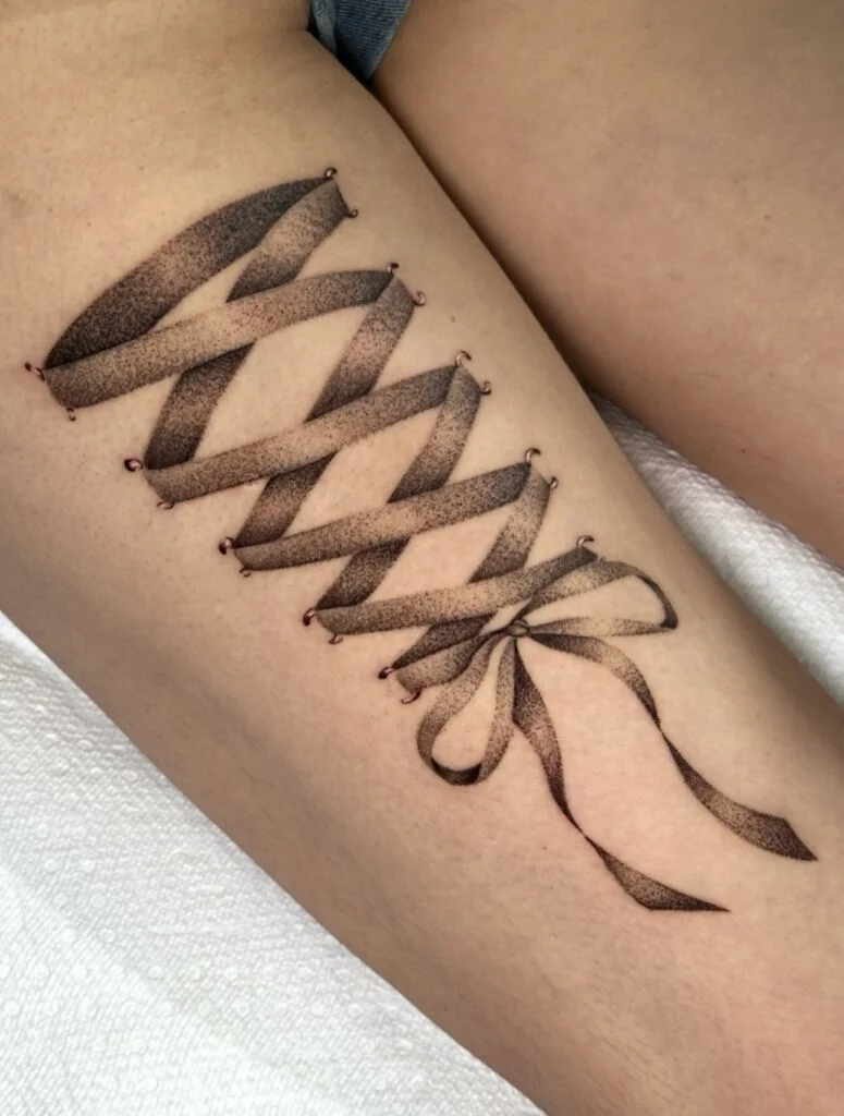 This tattoo features a beautifully detailed corset-style ribbon design, laced delicately across the thigh.