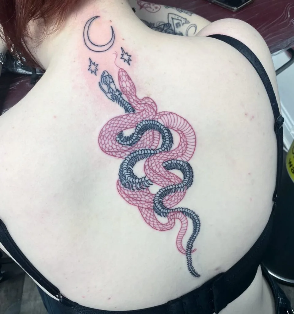The red snake symbolizes vitality and transformation, while the skeletal snake embodies decay, change, and inevitability. Placed on the upper back, this design flows naturally with the body, making it a bold and meaningful tattoo.