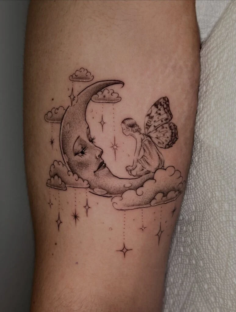 This tattoo depicts a dreamy scene with a fairy sitting gently on a cloud, facing a crescent moon with a serene face.