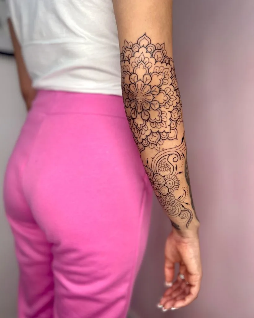This tattoo sleeve showcases a flowing design of mandala-inspired floral patterns beautifully wrapping around the forearm and elbow.