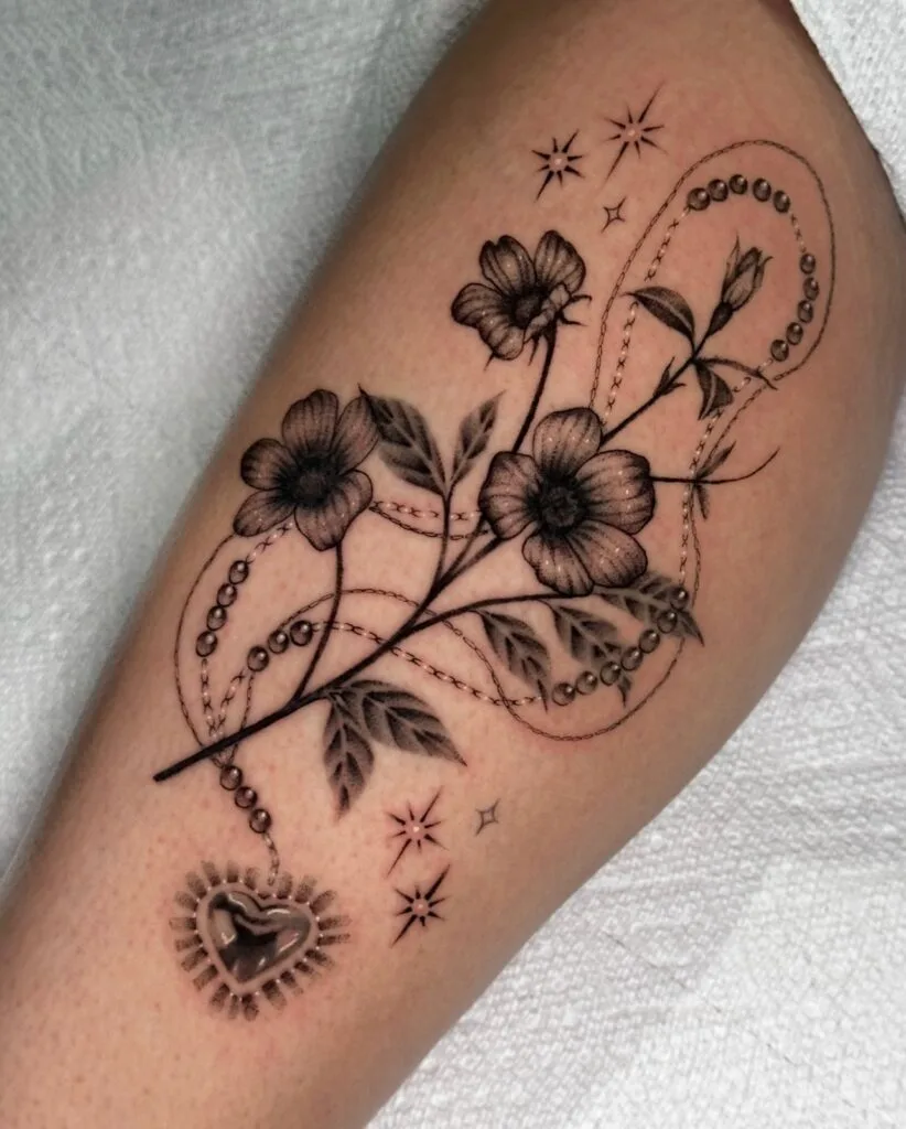 This tattoo beautifully combines delicate flowers with flowing rosary beads that wrap gracefully through the design.