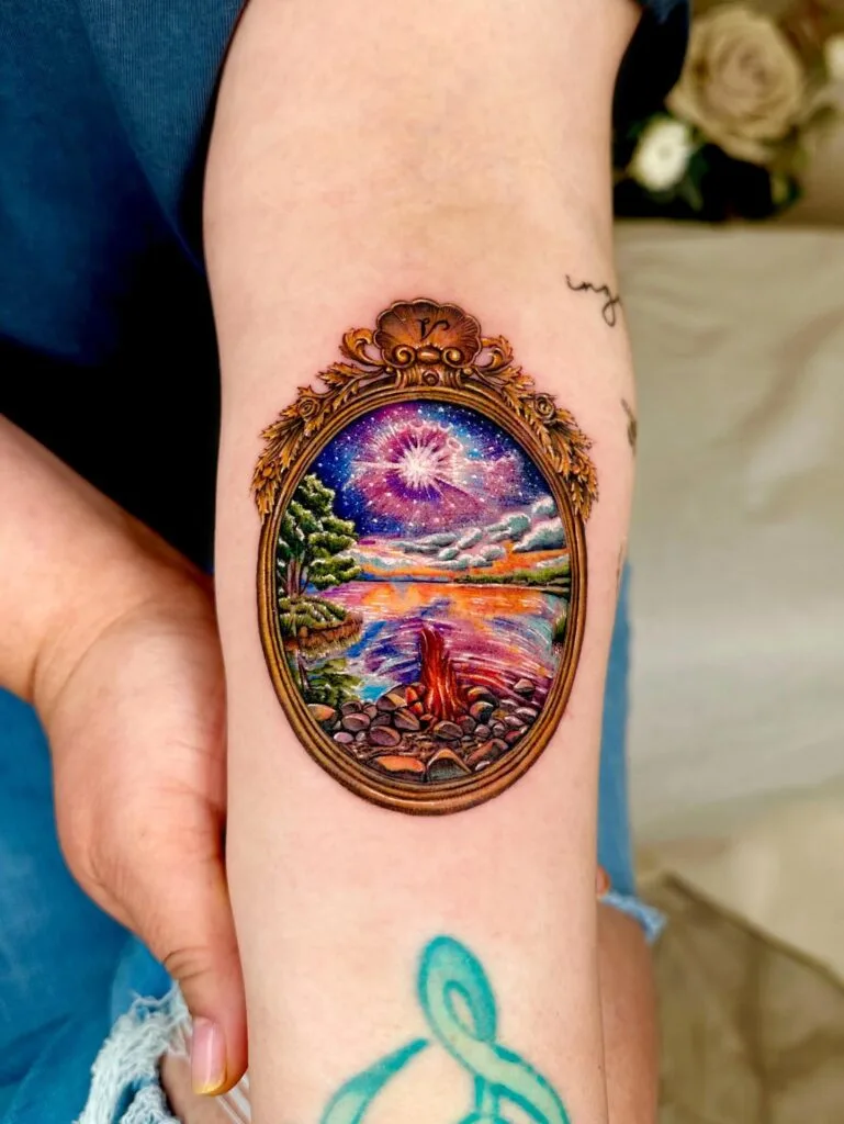 This tattoo is a vibrant framed scene representing the four elements — air, water, fire, and earth. Within the golden ornate frame, a colorful night sky with swirling winds symbolizes air.