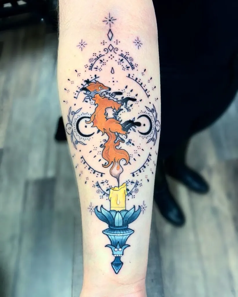 This tattoo features a glowing candle with its flame transforming into the shape of a tiny fox. The orange fox appears as though it’s leaping gracefully from the fire, blending seamlessly with the mystical design.