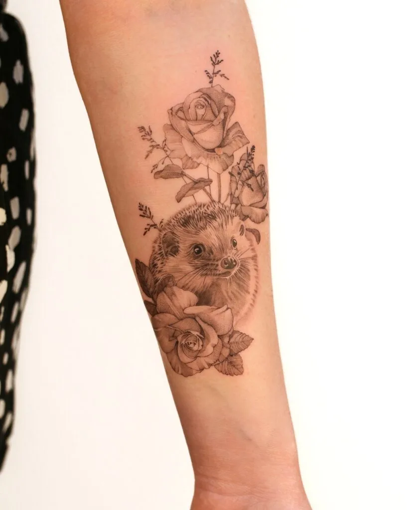 This tattoo features a realistic hedgehog surrounded by blooming roses, creating a heartwarming and symbolic design.