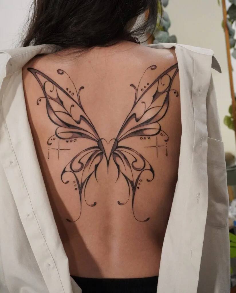 This large butterfly tattoo spreads beautifully across the entire back, creating an eye-catching and elegant design.