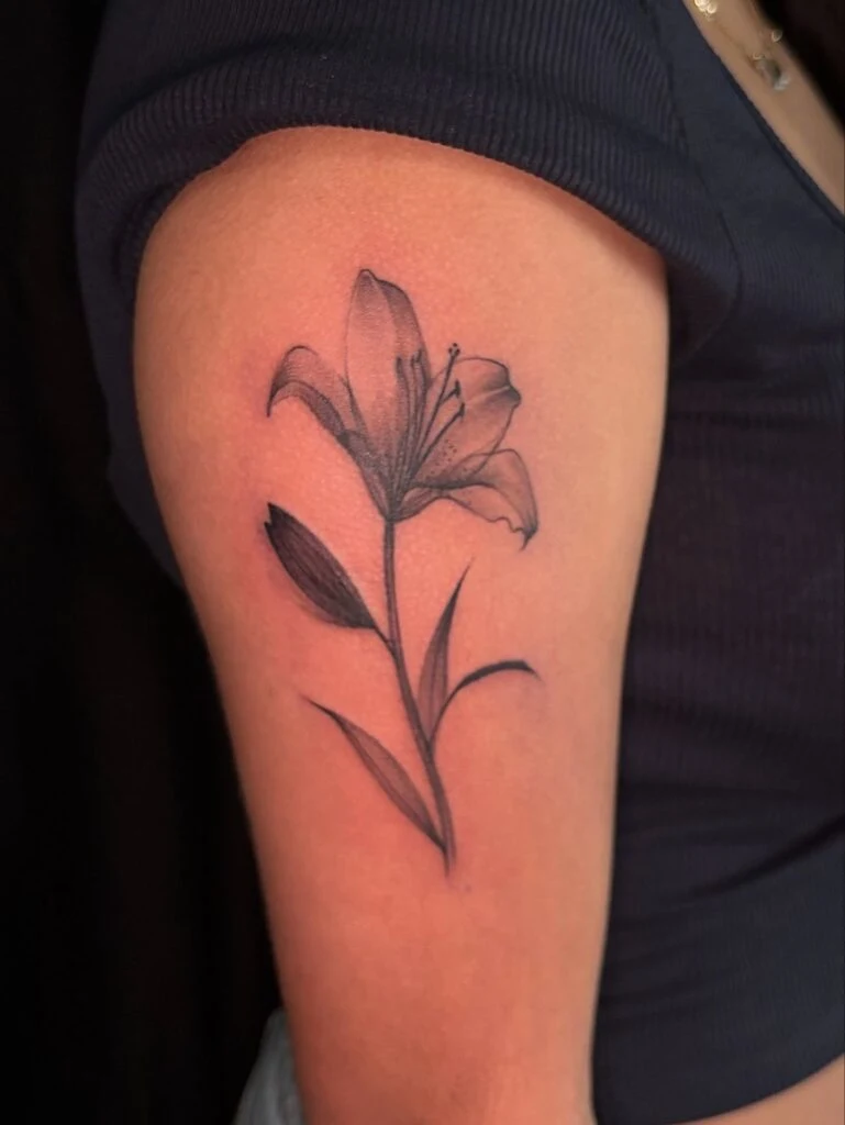 The soft shading on the petals and leaves gives the flower a graceful, realistic appearance, while the fine linework highlights its natural beauty. Lilies are often associated with purity, renewal, and devotion, making this tattoo both meaningful and timeless.