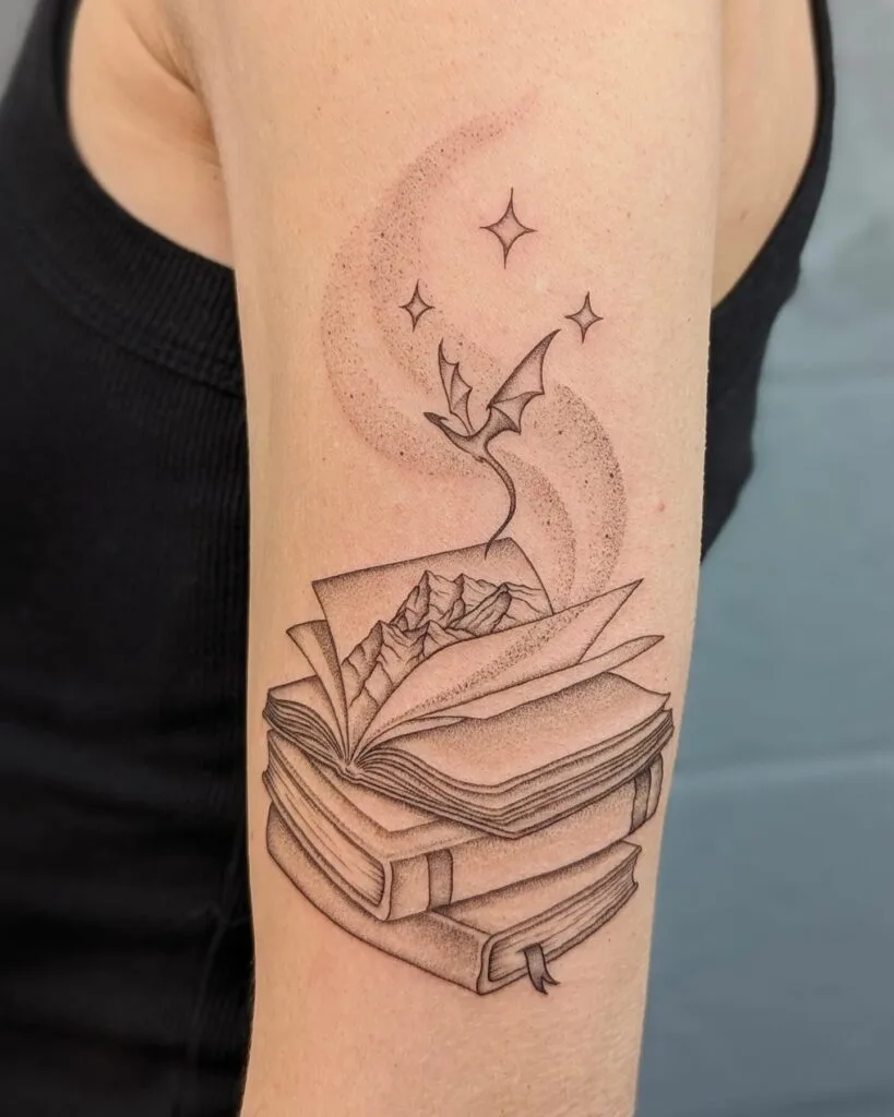 This tattoo features stacked books with one opened, releasing enchanting imagery into the air. A dragon emerges from its pages, surrounded by stars and soft swirling smoke.