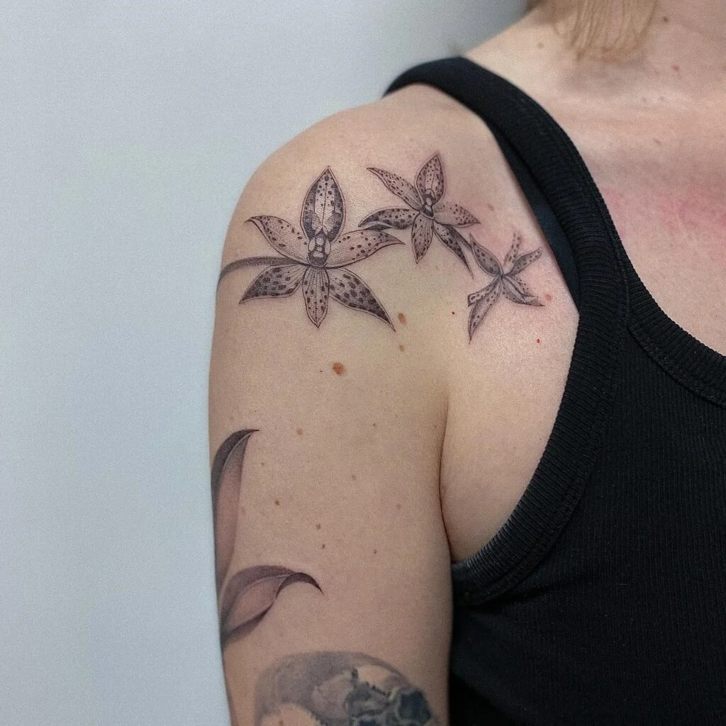 This tattoo features a delicate cluster of orchids flowing naturally across the shoulder. Each blossom is finely detailed with soft shading and dotted textures, capturing the flower’s elegance and grace.