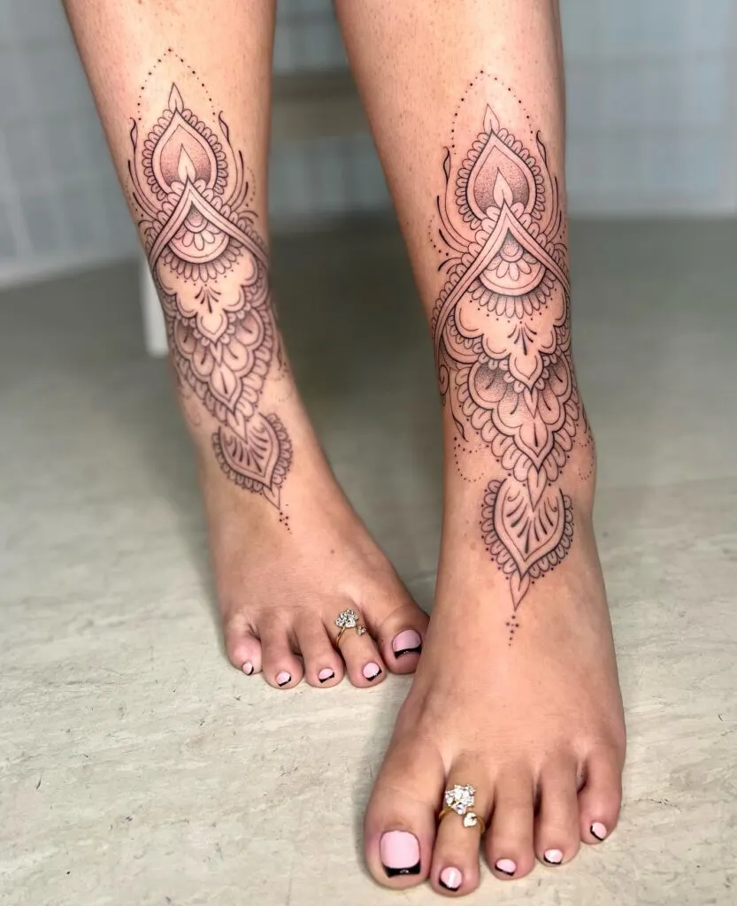 Ornamental tattoos often symbolize beauty, balance, and spiritual depth, making this style both meaningful and decorative. Perfect for women seeking elegance with symmetry, these tattoos showcase artistry while enhancing the legs with graceful detail and sophistication.