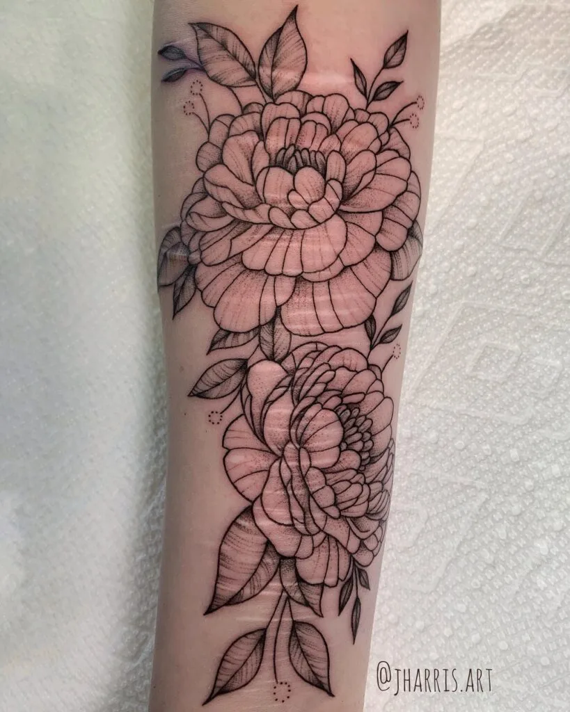 This tattoo showcases two large peonies with detailed petals and soft shading, beautifully arranged on the forearm.