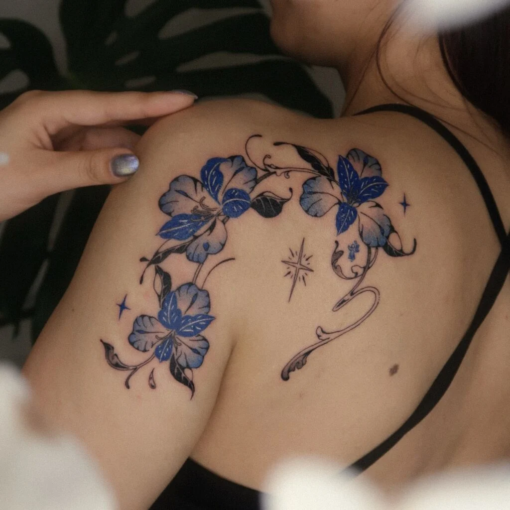 This tattoo features a stunning arrangement of blue Peruvian lilies flowing gracefully across the shoulder and upper back.