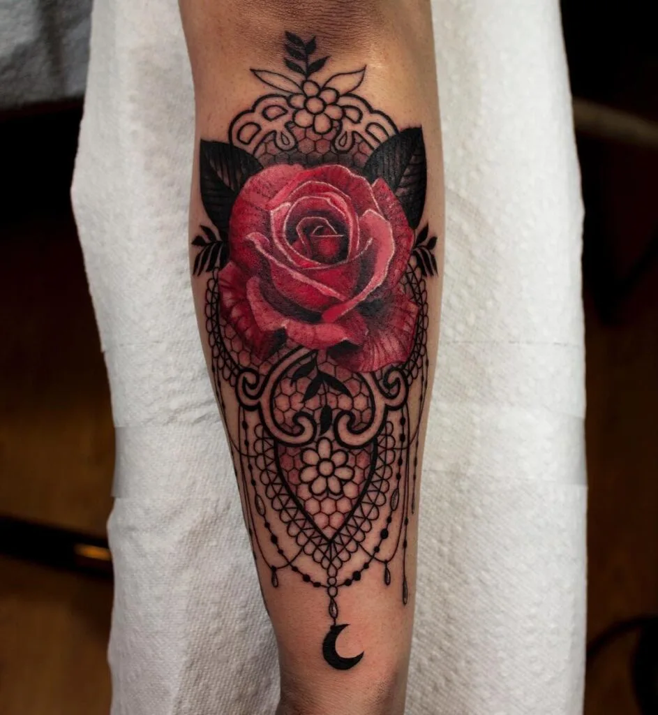 This tattoo features a striking red rose at the center, surrounded by bold black ornamental patterns. The intricate lace-like details and bead-inspired designs flow downward, giving the piece an elegant and decorative style.