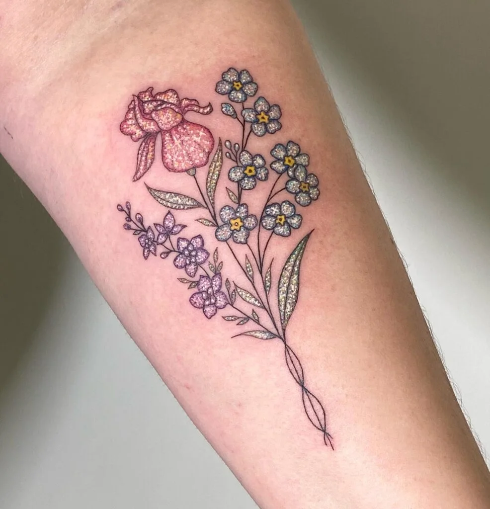 This tattoo features a delicate bouquet of flowers designed with a glitter-like effect that makes it truly enchanting.