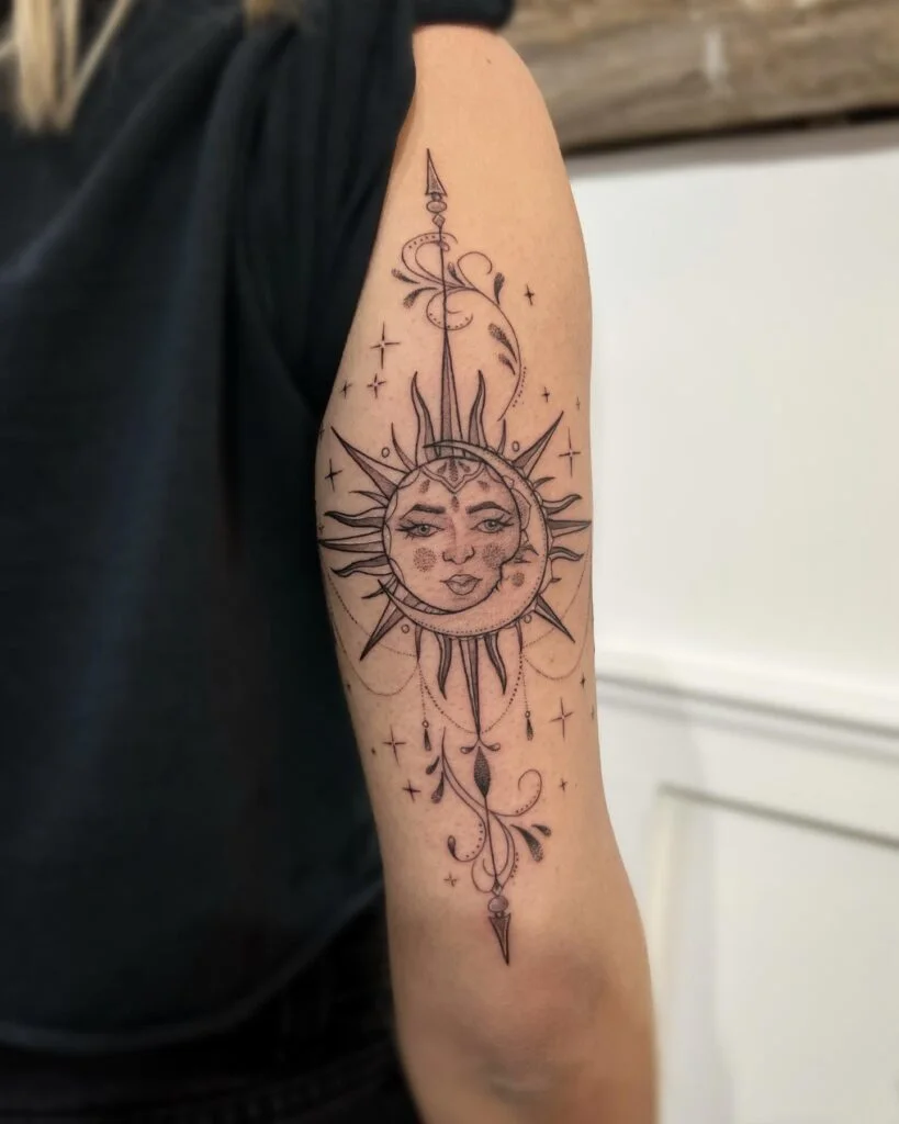 Suns often symbolize vitality and strength, while moons represent intuition and cycles, making this design deeply meaningful. Placed on the upper arm, it becomes both powerful and graceful. A perfect tattoo for women inspired by cosmic beauty and balance.