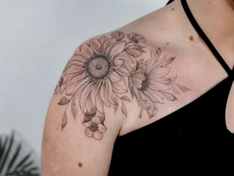 This tattoo showcases a cluster of large sunflowers delicately spread across the shoulder and upper chest.