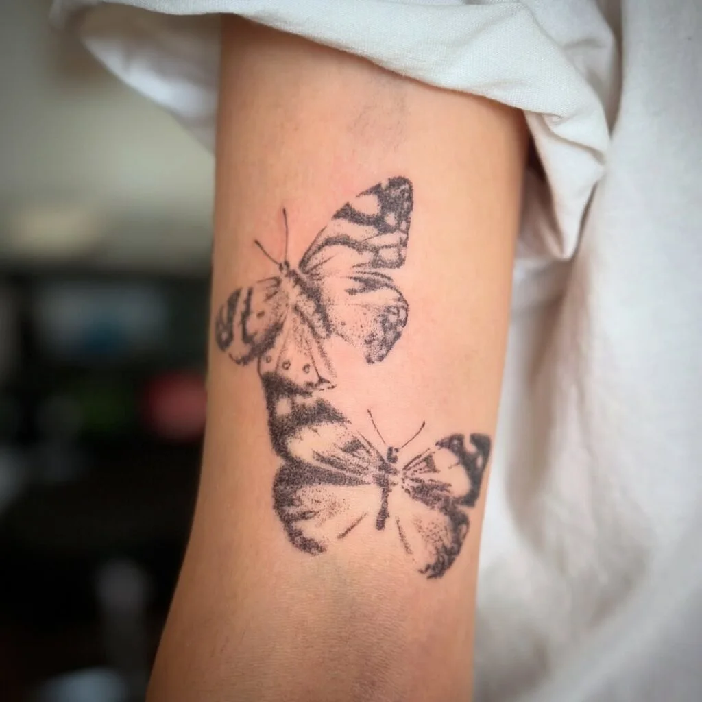 This tattoo features two butterflies in soft black shading, gracefully placed on the arm. The butterflies carry a sense of freedom, transformation, and lightness, making them deeply meaningful symbols.