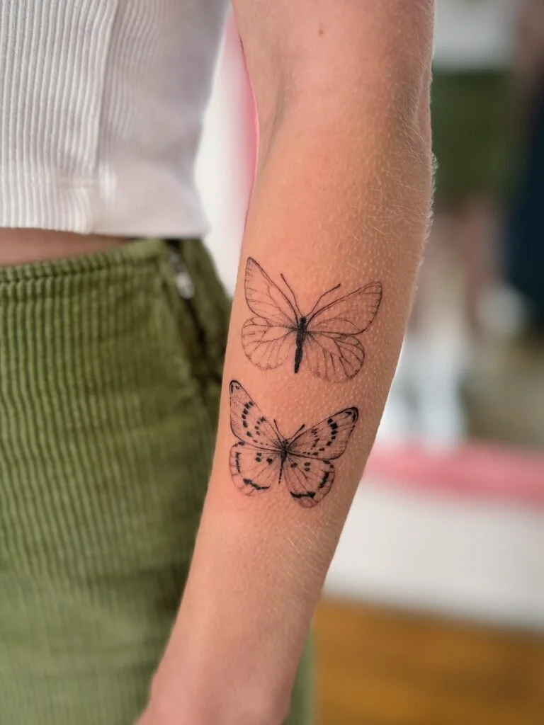 This tattoo features two delicately detailed butterflies placed vertically on the forearm. The upper butterfly is drawn with fine, light lines, creating a soft and airy look.